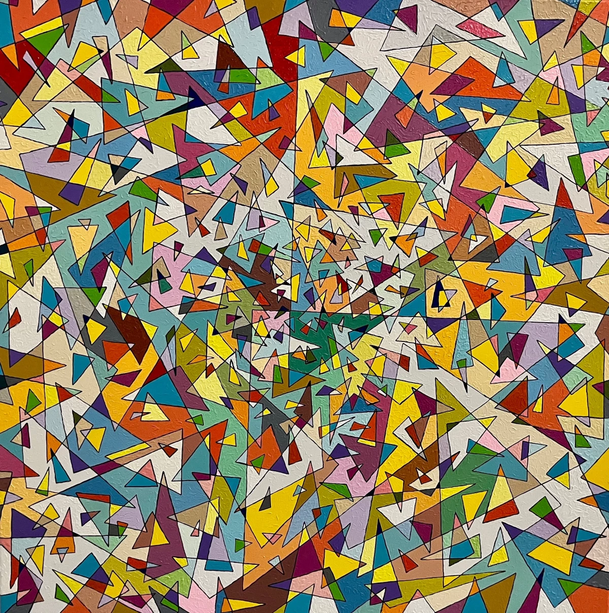 These three paintings focus on the very first moments of creation, on the instant when God brought light to heaven and earth. But how on earth could such a thing have looked? It is almost impossible to imagine. So I turned once again to geometry. The simplest form I can paint is the circle. You only need two pieces of information: the center and the length of the radius. In other words, two points. Does it remind you a little of the Big Bang? You are not alone. The next step is to add a third piece of information. This creates a triangle. One more, and it becomes a square or a polygon. Circles, semicircles and triangles are basic elements of nature as well as of human structures. Without them, there would be no architecture, neither in the literal nor in the metaphorical sense. And in the next painting of this series, as you may already suspect, it is all about squares and polygons!