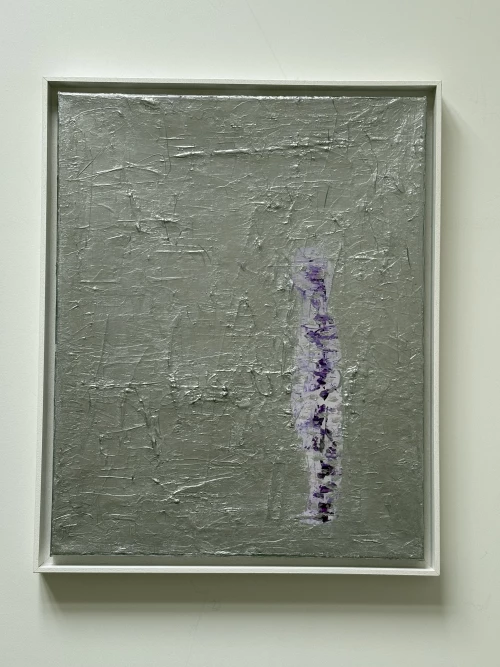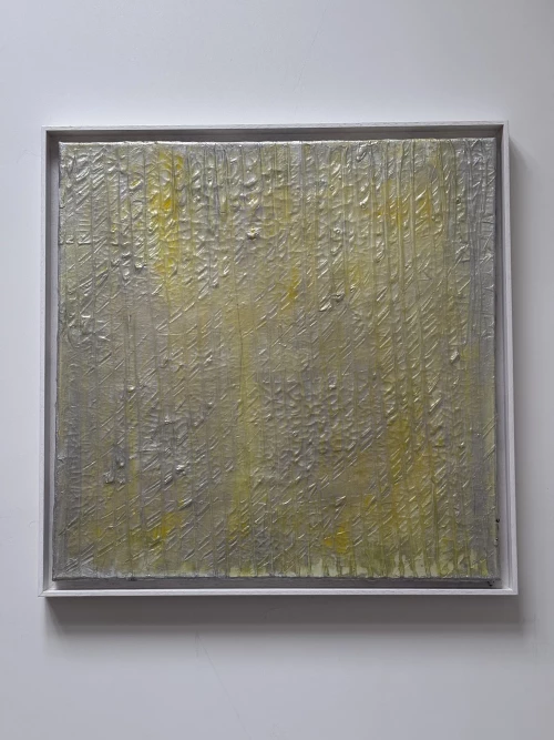 Seine Werke entstehen in einem schichtweisen Verfahren. Farbe wird aufgetragen, verdichtet und wieder geöffnet. Die Oberfläche trägt diese Prozesse als sichtbare Spuren. Riefen, Überlagerungen und lineare Strukturen gliedern den Bildraum und geben ihm Rhythmus. Häufig bildet ein silbrig gefasster Grund das Bildfeld, der Licht aufnimmt und in Bewegung hält.