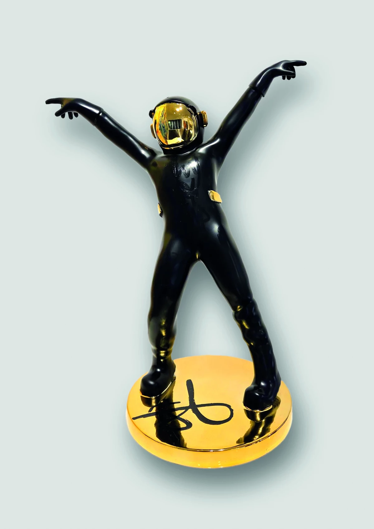 Der neue »Spaceman« von Brendan Murphy steht in mattem Tiefschwarz und bringt sofort Spannung in den Raum. Die samtige Oberfläche schluckt das Licht, lässt jede Kontur klarer wirken und gibt der Figur eine fast schwebende Ruhe. Über dem dunklen Anzug leuchtet der Helm aus poliertem Gold. Er spiegelt alles um sich herum und zieht den Betrachter in das Werk hinein – man sieht sich selbst im glänzenden Visier, als Teil der Szene. Die weit ausgebreiteten Arme wirken wie ein Jubel, offen und einladend. Auf dem Anzug tauchen in Murphys typischer Handschrift kurze Botschaften auf, Fragen nach Träumen und Möglichkeiten. Sie wirken jetzt wie in den Körper hineingeschrieben, nicht bloß dekoriert. So zeigt sich der »Spaceman« als Mischung aus Popkultur und Nachdenklichkeit: luxuriös mit seinem goldenen Sockel, zugleich still und rätselhaft im matten Schwarz, ein Bild von Freiheit, Aufbruch und der eigenen Rolle im Kosmos.