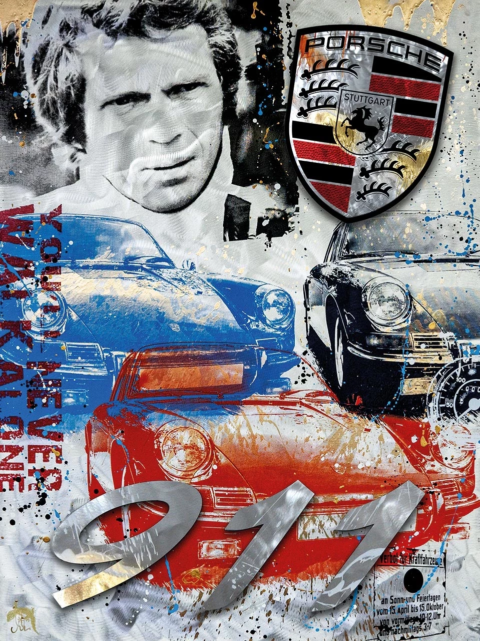 In »Thrill of Sounds« verwebt Devin Miles automobile Legende, männlichen Mythos und popkulturelle Ästhetik zu einer bildgewaltigen Hommage. Das zentrale Porträt zeigt Steve McQueen. Der Schauspieler, Rennfahrer und die Stilikone ist Sinnbild kompromissloser Coolness. Umgeben ist er von klassischen Porsche 911-Modellen in rot, blau und schwarz, eingefasst von Farbspritzern. Der vertikal verlaufende Schriftzug You’ll never walk alone begleitet das Motiv wie eine Randnotation, halb Erinnerung, halb Parole. Das glänzende Porsche-Wappen oben rechts wirkt wie ein Emblem für Status und Zugehörigkeit. Der groß gesetzte Schriftzug »911« in angedeutet metallischer Prägung greift das Material- und Markendenken auf, das sich durch die gesamte Komposition zieht. Miles inszeniert hier Technikfaszination als Sound-Tableau aus Geschwindigkeit, Stilwillen und Nostalgie. Das Bild lebt von der Überlagerung: Rennsportästhetik trifft auf Street-Art-Elemente, Heldenkult auf persönliche Sehnsüchte. Der Porsche wird als kulturelles Symbol zwischen Bewegung, Freiheit und Erinnerung gezeigt.