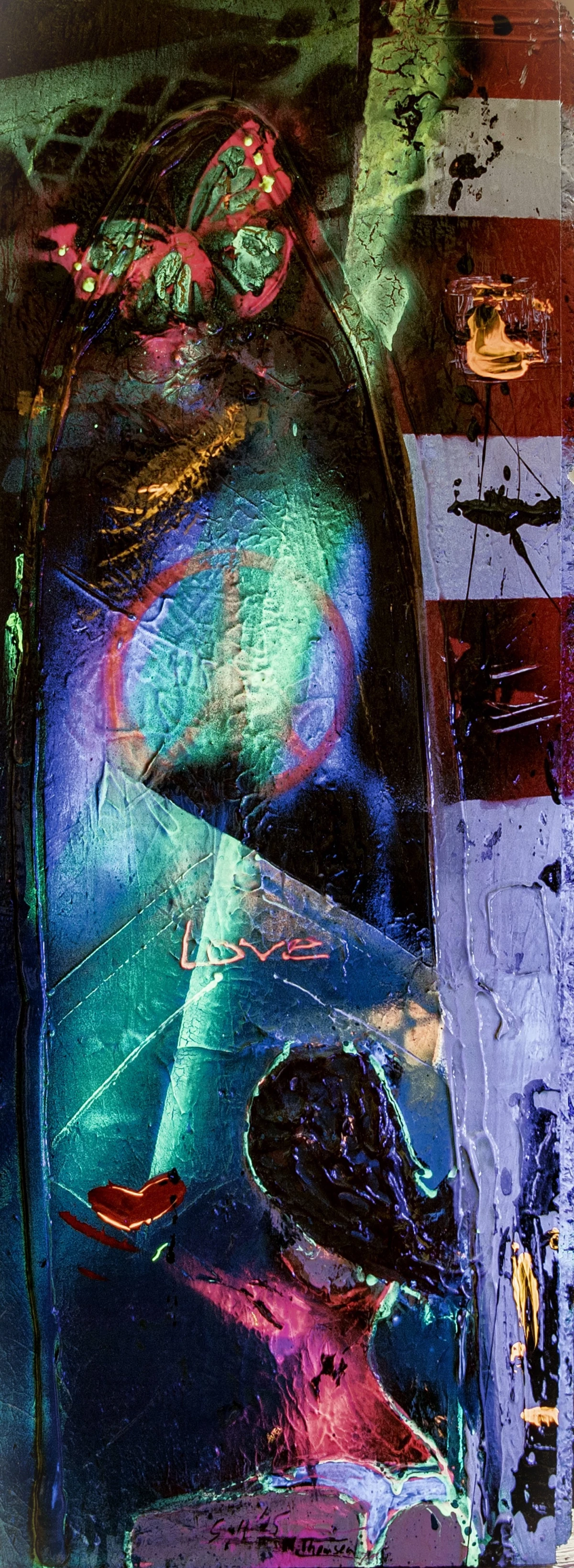 25 x 65 cm, Holz, Multimedia Acryl gemalt und gesprayt mit UV-Effekten und Hochglanz Lack