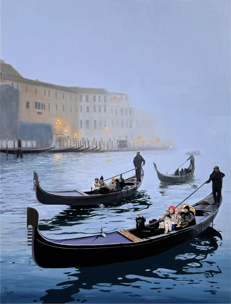 Hier zeigt Thomas Düwer eine ruhige, fast klassische Szene: Gondeln gleiten durch dichten Nebel, das Ufer versinkt in pastelligen Fassaden und gedämpftem Licht. Die Komposition erinnert an Vedutenmalerei, doch die Figuren im Vordergrund bringen Gegenwart ins Bild – Touristen mit Mützen, Handys, Selfiehaltung. Die sanfte Unschärfe im Hintergrund kontrastiert mit der klaren Detailzeichnung der Boote. Lichtreflexe tanzen auf dem Wasser, alles scheint eingefroren im Moment zwischen Bewegung und Stillstand. Dürer gelingt hier ein subtiler Bruch: romantische Kulisse trifft auf touristische Realität. Ein Bild zwischen Sehnsucht und Schnappschuss, sorgfältig komponiert und doch voller beiläufigem »Heute«