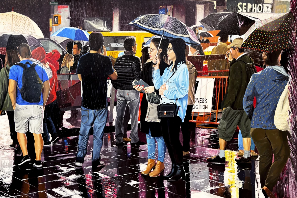 Thomas Düwer zeigt eine Boradway-Straßenszene im Regen, deren Boden wie ein Schachbrett wirkt und die gesamte Komposition in eine Bühne oder ein Spielfeld verwandelt. Zwischen den glänzenden Spiegelungen bewegen sich Menschen mit sehr unterschiedlichem Verhalten: Einige halten ihre Schirme fest geschlossen über den Köpfen, andere gehen unbeeindruckt ohne Schutz durch den Regen. Zugleich tauchen Handys und Kopfhörer auf, die eine zweite, digitale Ebene eröffnen. So entsteht ein Bild, das den Rhythmus urbanen Lebens einfängt zwischen Schutz und Offenheit, zwischen Vereinzelung und gleichzeitiger Eingebundenheit in eine gemeinsame Situation.