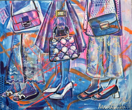 Ihre Malerei oszilliert virtuos zwischen Pop-Art und Modern Art und manifestiert sich in expressiven, großformatigen Porträtzitaten von Stil-Ikonen aus Mode, Film und Sport. Kravchenko versteht es, ihre Leinwände zu lebendigen Bühnen zu verwandeln, auf denen collagierte Elemente wie Zitate und Textfragmente eine eigene Sprache entwickeln. Besonders charakteristisch für ihr Werk sind leuchtende Acrylfarben und die spektakulären Neonakzente, die unter Schwarzlicht eine nahezu magische Wirkung entfalten.
