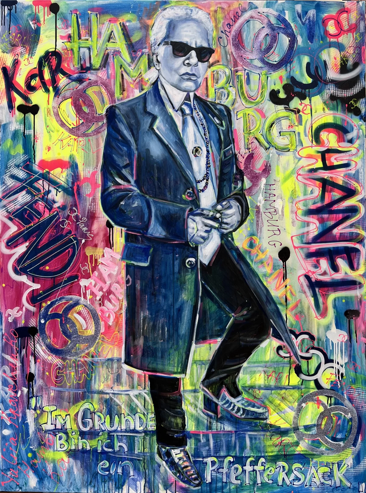 Karl Lagerfeld als kühl stilisierte Ikone, eingebettet in eine visionäre Kollision aus Luxusmarken, Street-Art-Codes und lokalem Statement. Der Untertitel ›Im Grunde bin ich ein Pfeffersack‹, Lagerfelds berühmtes Zitat über seine hanseatische Herkunft, verankert die globale Modefigur im lokalen Mythos: Hamburg. Die Figur Lagerfelds ist monochrom in sophistizierten Blau- und Grautönen gehalten, mit betontem Lichteinfall, hochglänzendem Schuhwerk, steifem Kragen, Sonnenbrille: das stilistische Korsett seiner ikonischen Persona. Der Hintergrund explodiert dagegen in dynamischen Neonfarben, Spray-Elementen, kalligrafischen Zügen, Markenlogos (Fendi, Chanel, Karl, Chance) und Tags aus der urbanen Graffitikultur. Diese kraftvolle Gegenüberstellung macht das Werk zu einem visuellen Palimpsest aus Hochglanz und Subkultur. Kravchenko entwickelt hier eine bahnbrechende kulturelle Synthese: Lagerfeld wird in ein faszinierendes Spannungsfeld zwischen globalem Stilimperium und hamburger Pfeffersack-Mentalität gestellt. Die gestische Contemporary-Malweise und grellen Farbkontraste entlarven die kontrollierte Luxus-Ästhetik als Projektionsfläche. Vergleichbar mit der bedeutsamen Appropriation Art eines Richard Prince oder der visuellen Überlagerungsstrategie von Deborah Kass, kombiniert Kravchenko klassische Porträtmalerei mit dem innovativen Vokabular der Gegenwart: Tags, Splashes, Brand Codes. Mit großer und ganz persönlicher, fast handschriftlicher Zuneigung zum Sujet. Lagerfeld zwischen überhöhter Pose, handschriftlichem Impact und Markengewitter entwirft Kravchenko eine komplexe Bildfläche, in der sich Mode, Herkunft, Sprache und Selbstinszenierung verschränken.