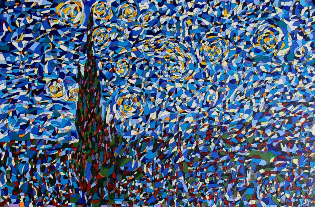 "Starry Night" represents a remarkable exploration of van Gogh's iconic masterpiece "De sterrennacht" (1889) in the context of postmodern appropriation art. Behmel's approach reveals a fundamental shift from van Gogh's expressive painting style to a fragmented, kaleidoscopic aesthetic. The painterly realisation of a faceted surface transforms van Gogh's dynamic brushwork into a visual language that not only depicts light, but also seems to...
