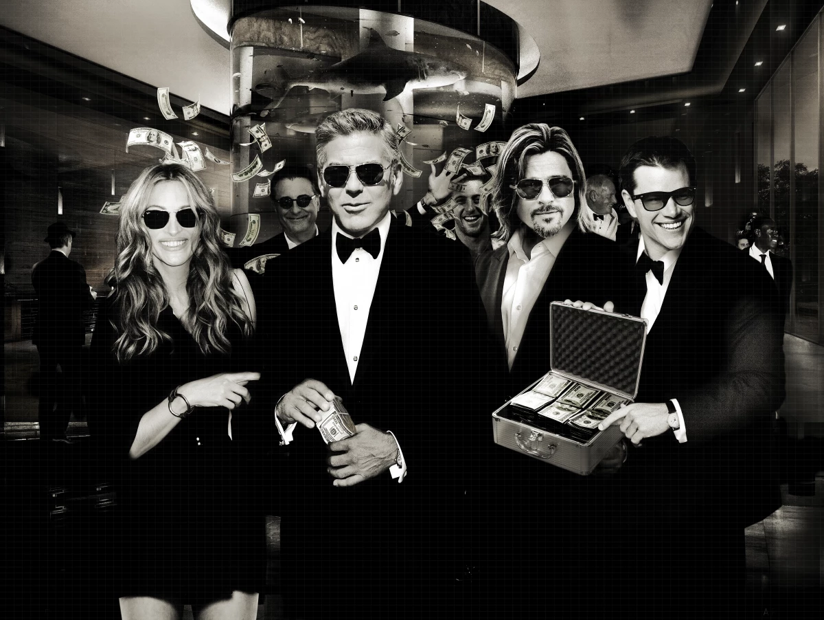 A moment like the aftermath of a perfect coup: Julia Roberts, George Clooney, Brad Pitt and Matt Damon walk out of the casino as if they hold the night in their hands. Dollar bills still spin in the air, too slow to have reached the floor. Clooney carries the bundle with casual ease, Damon opens the suitcase as if it were only a prop, while Pitt lets his gaze drift over the rim of his glasses. Nothing in their faces betrays urgency, it is the instant when everything has worked, and the world belongs to them for the length of a single heartbeat.