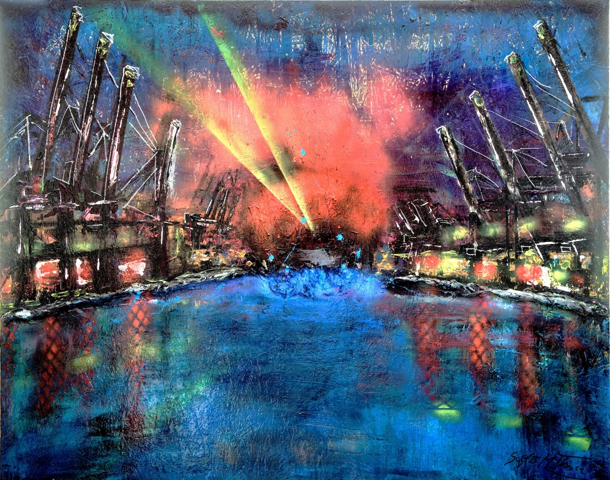 125 x 100 cm, Multimedia, spatula, painted and sprayed on wood with UV effects and high-gloss varnish